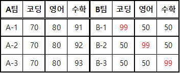 각각의 과목 관점으로 A팀과 B팀을 비교해보면