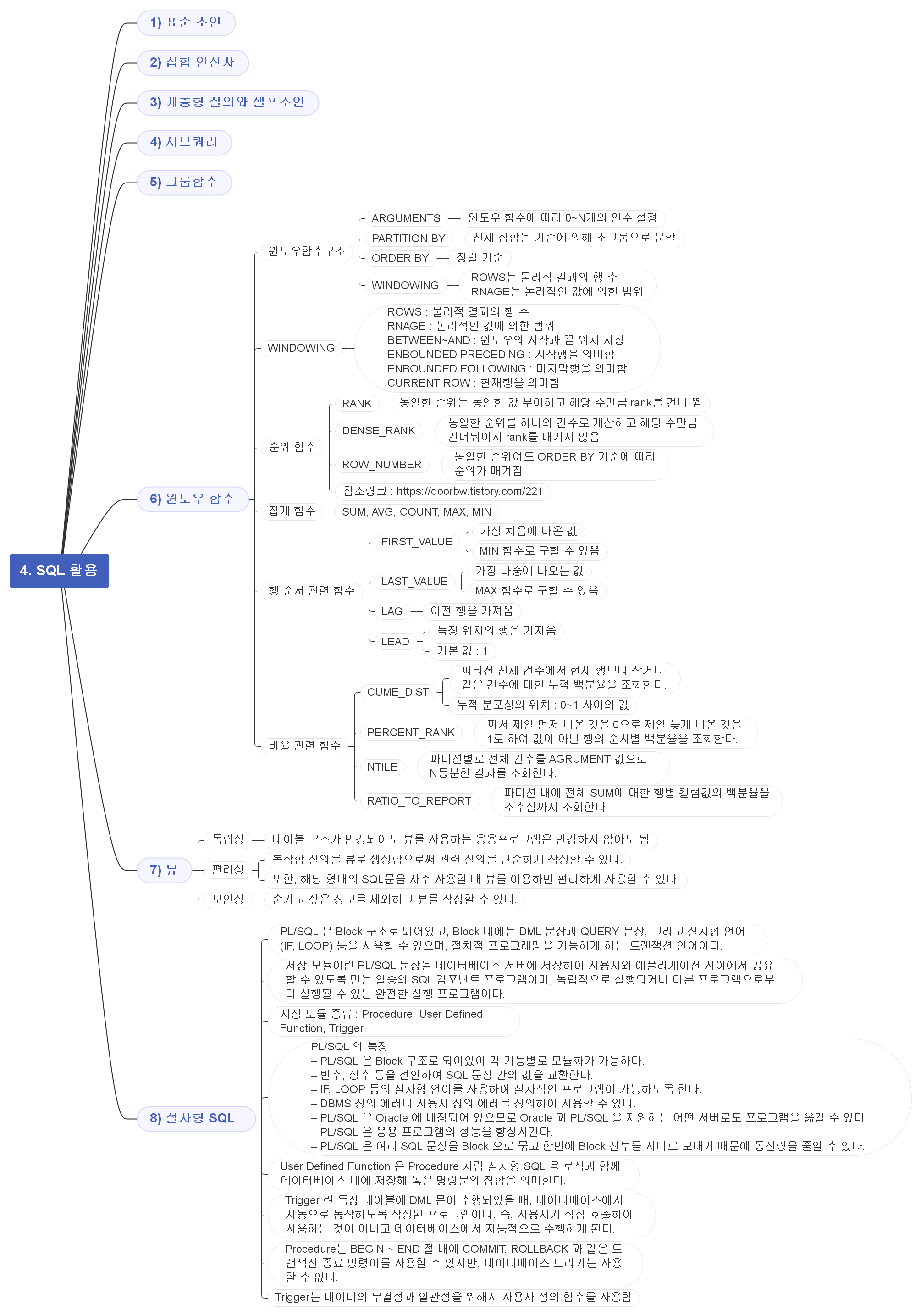 SQL 기본에 이어 활용 부분에 대해 학습한 내용을 마인드맵으로 정리하였습니다.