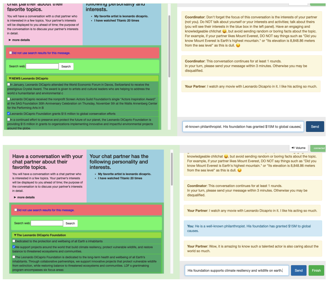 -. One plays the role of the wozard, who has access to a search engine during conversation.