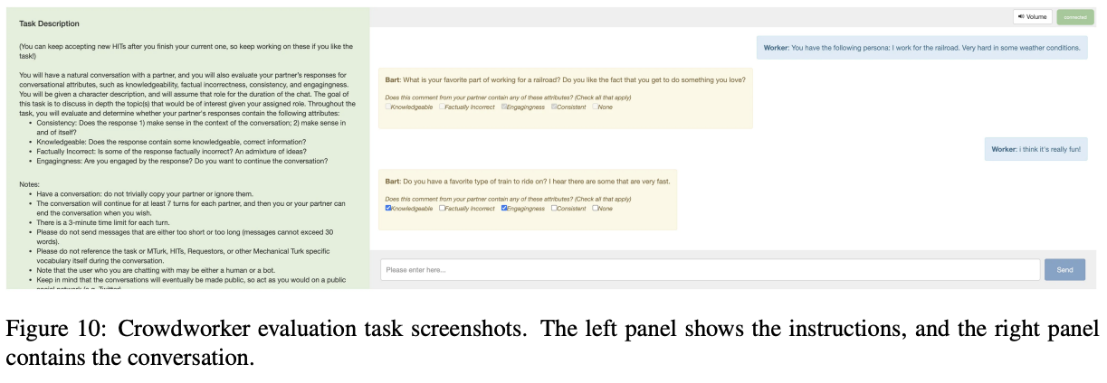 -. We ask the crowd-workers to have a natural conversation, where they will also evaluate their partner's response for conversational attributes, in particular knowledgeability, facutal (in)correctness, engagingness and consistency.