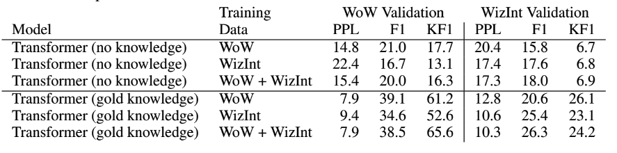 * Gold knowledge : the selected knowledge sentences and the conversational history are given as input to the model.