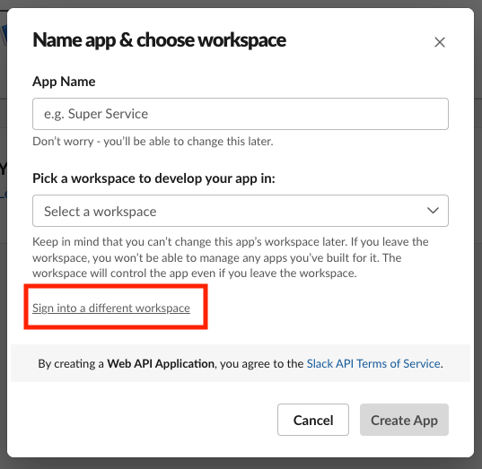 2. Name app & choose workspace에서 Sign into a different workspace를 클릭합니다.