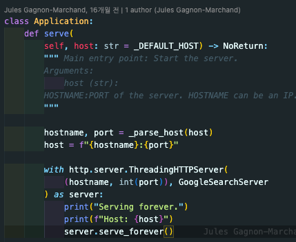 그 뒤에 serve라는 것은 search_server.py 파일에서 Application에 있는 serve입니다.