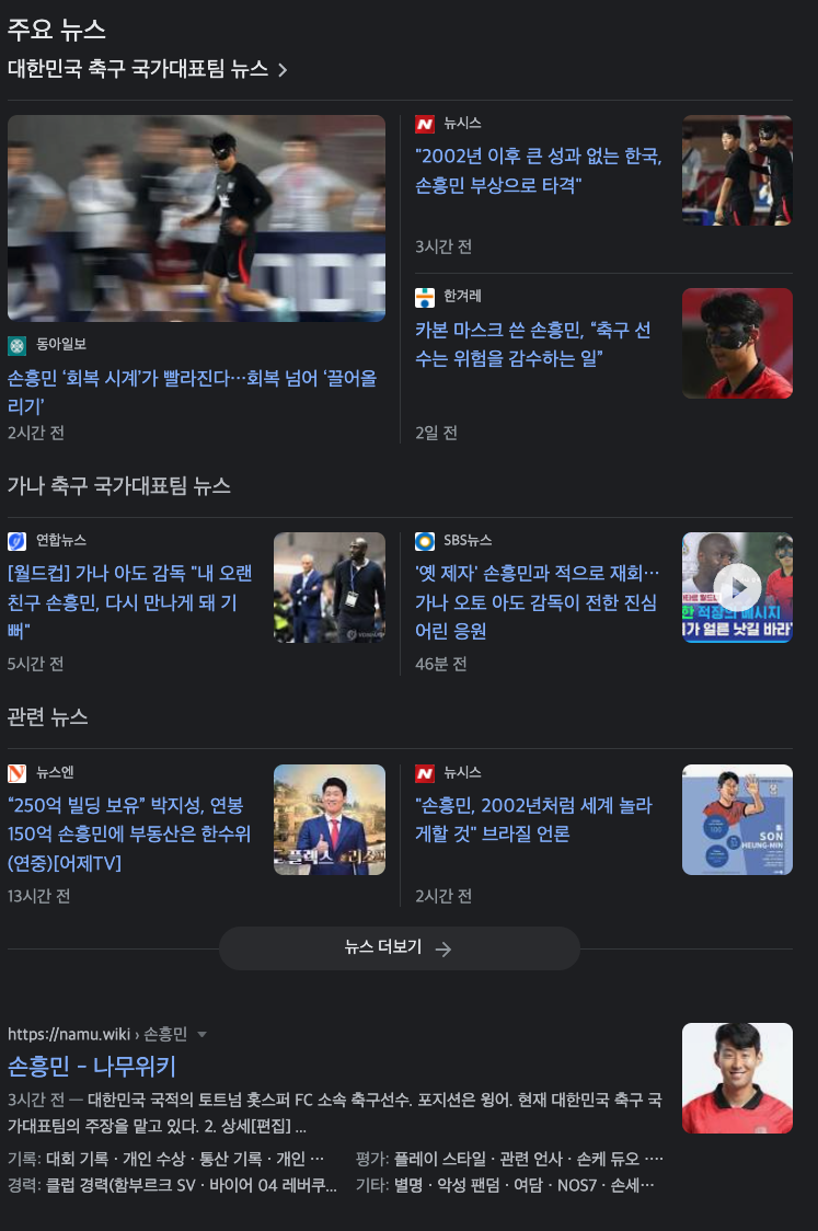 저는 손흥민을 좋아해서 손흥민을 검색해보았습니다.
