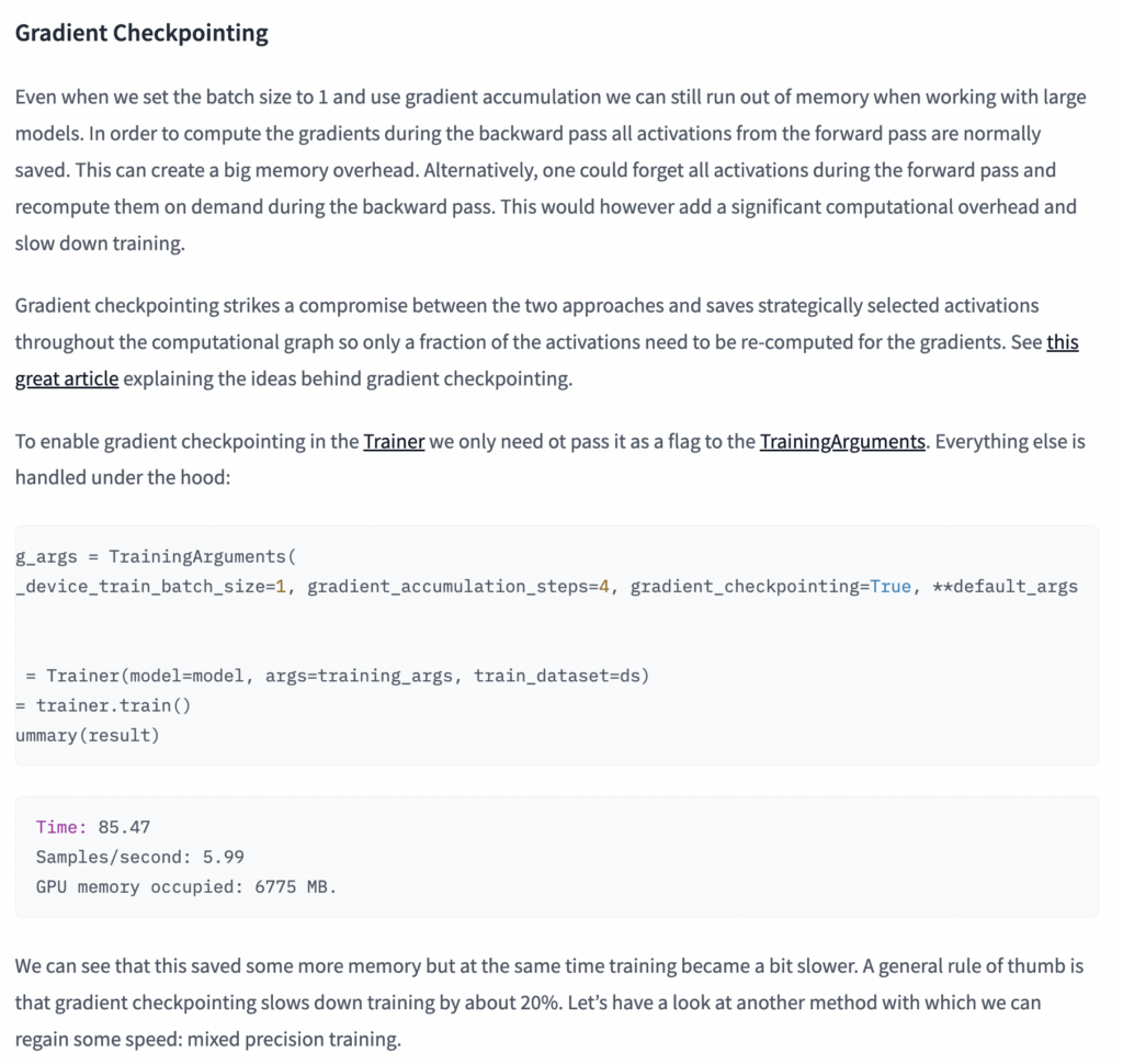 그러나, 실제로 코드를 나중에 사용해보시면 아시겠지만, GradientCheckPointing은 Deepspeed:zero3에 더 많이 사용하시는 것을 보실 수 있습니다. 분산컴퓨팅할 때 반드시 필요하거든요!
