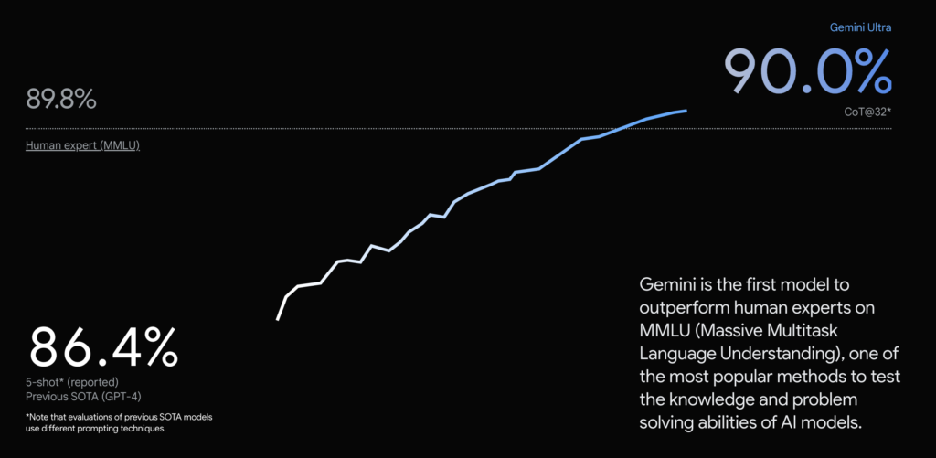 이 이미지는 언어이해도(MMLU) 성능을 제미나이와 GPT4를 비교해놓았습니다. 자세하게 보시면, 하얀색 조그마한 글씨로 GPT-4는 5-shot이고, gemini는 CoT32가 적혀 있습니다. 일반인들께서는 이게 먼데? 라고 말하실 수 있지만, 이건 엄청난 차이가 있는 것입니다.