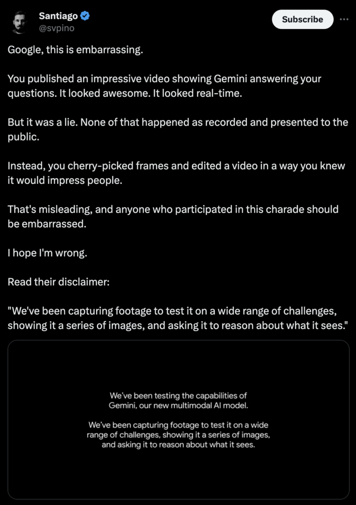 여러분이 보는 것은 연속된 이미지를 보여주고 추론을 한 것이라고 이야기합니다. 그런데, 영상을 보면 영상을 넣어 실시간으로 인공지능이 대답하는 것처럼 보입니다. 영상을 넣어서 실행한게 아니라 이미지를 넣어서 인공지능이 대답한 것을 영상으로 편집한 것입니다.