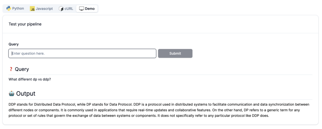 우리의 API는 사용자 친화적이면서도 적응성이 뛰어나 초보자가 단 4줄의 코드만으로 LLM 기반 애플리케이션을 쉽게 만들 수 있습니다. 동시에 우리는 RAG 파이프라인의 모든 측면에 대해 광범위한 사용자 정의 옵션을 제공합니다. 여기에는 LLM, 벡터 데이터베이스, 로더 및 청커 선택, 검색 전략, 순위 재지정 등이 포함됩니다.