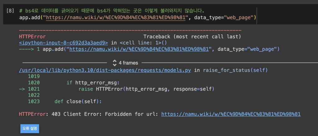 셋째, web_page dtype의 경우 bs4(beautiful soup)으로 데이터를 불러오기 때문에 bs4가 막혀있는 곳은 아래 이미지처럼 데이터가 로드되지 않는 오류를 볼 수 있습니다.