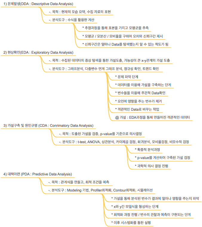 DDA -> EDA -> CDA -> PDA되며, 각 단계별 목적과 분석도구를 알아보았습니다.